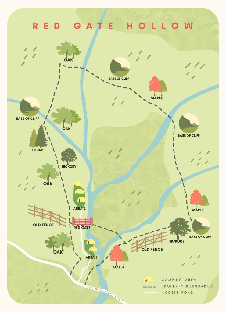 Red Gate hollow is rucked away from the Horns River Road with a single pint of entry. Once inside, the boundaries of the land stretch to the base of the surrounding cliffs and 2 secondary ridges along the east and west side.